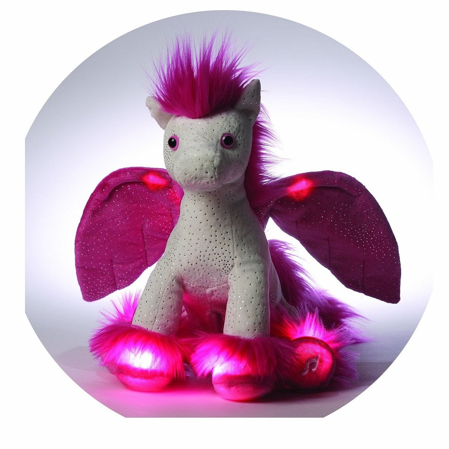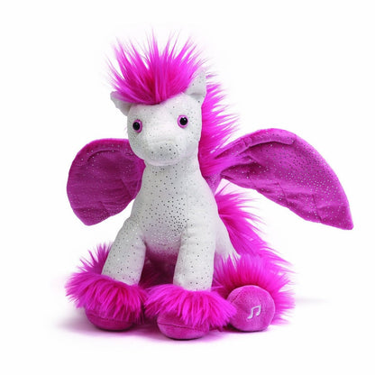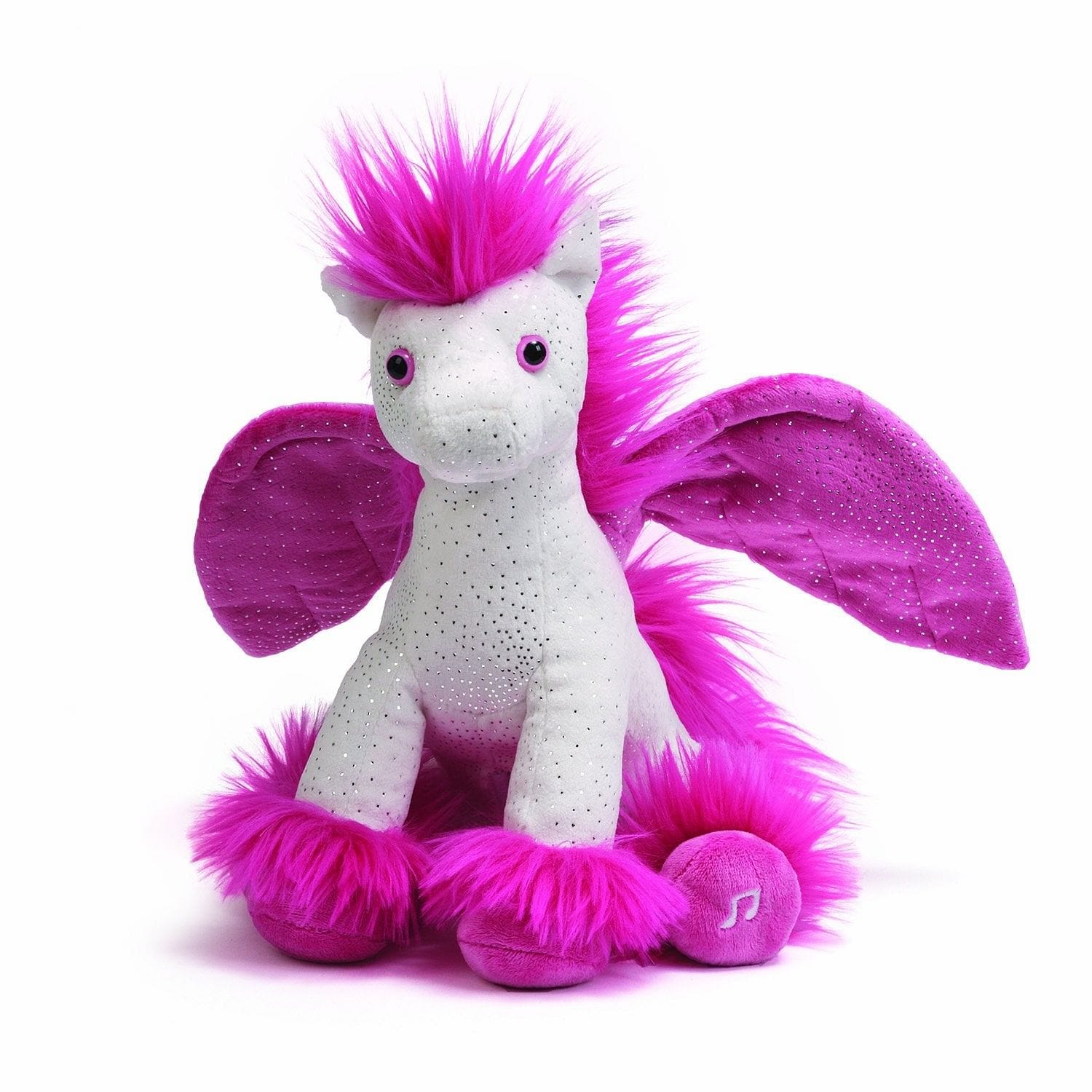 GUND is proud to introduce the Moonwind - glittery fantasy creature that brings magic and imagination into everyday life. Moonwind is a 9" seated pink pegasus complete with flappable wings, matching plush mane, long flowing tail, and fluffy hoof accents. At the press of a button, five LED lights on her wings and hooves blink while sparkly magical sounds play. The magical music plays for 3 seconds and another for 5.5 seconds. 3AAA replaceable batteries.