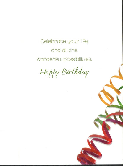 5 x 7 card showing a champagne bottle with ribbons in a bucket, with the words "Celebrate your birthday". The inside reads, "Celebrate your life and all the wonderful possibilities. Happy birthday."