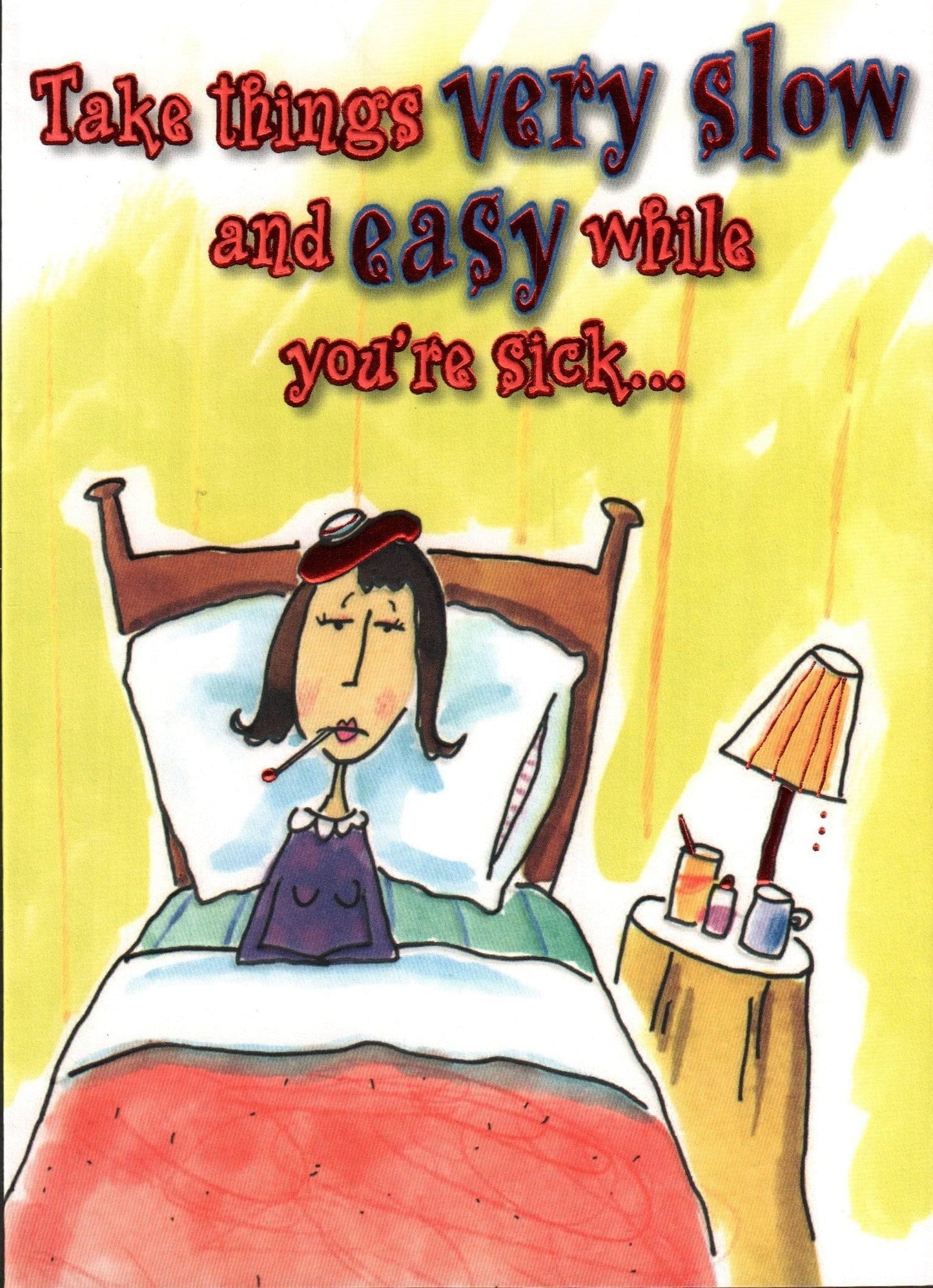 Outside: A drawing of a woman in bed with the words, "Take things very slow and easy while you're sick..."