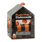 Set includes 1 printed and 2 checker dishtowels folded inside a decorative house - shaped gift box.