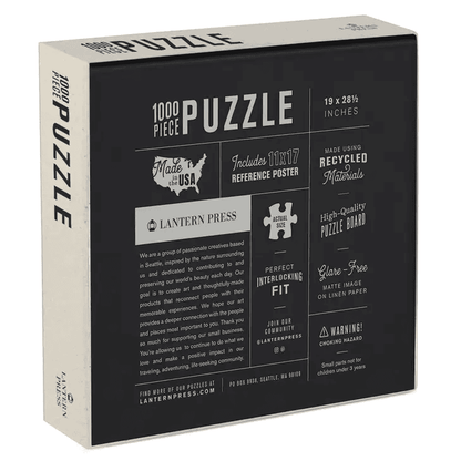 Our premium 1000-piece puzzles feature artwork on quality materials in vibrant full color. We use eco-friendly ink and packaging, fsc certified paper, recycled materials, sourced responsibly, and planet friendly. Made in usa, supporting domestic production. • puzzle: 18 ½" x 27 ¾", box: 9" x 9" x 2" • made in the usa of 100% recycled materials • fsc-certified linen paper & eco-friendly in • extra-thick eska puzzle blue board • 1,000 random cut pieces with perfect interlocking fit • reference poster included