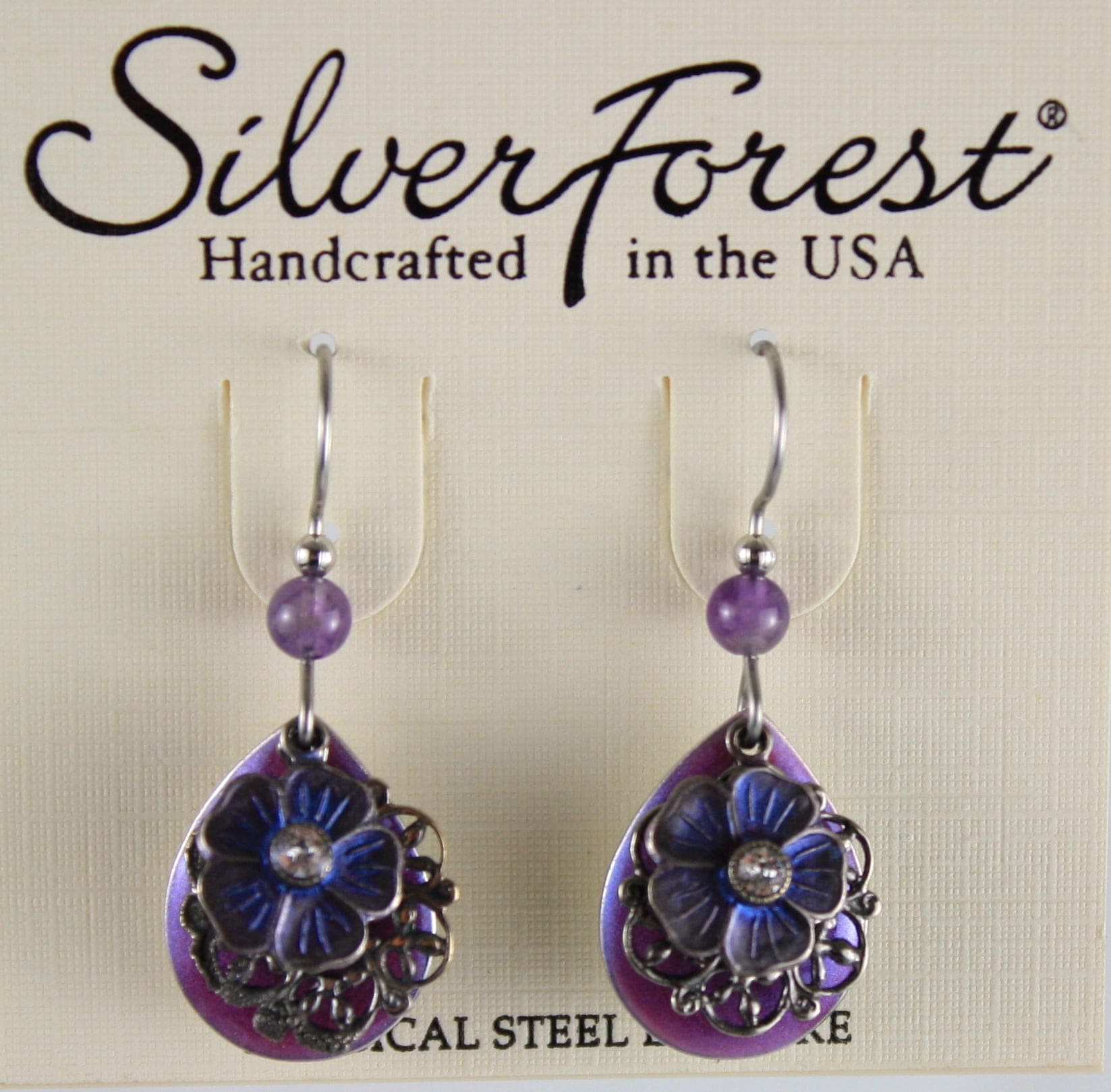 Tear With Flower Earring on surgical steel ear wire by Silver Forest of Vermont. Made in the USA.