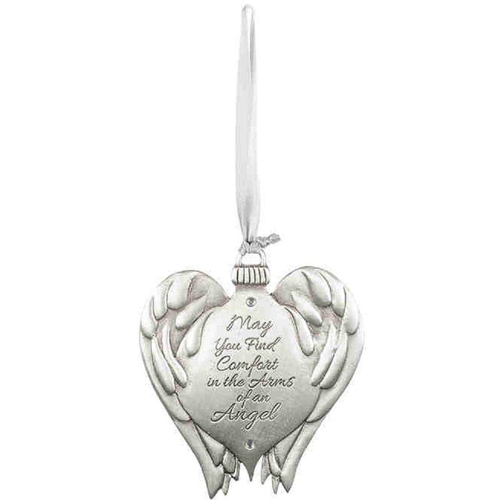 Angle Wings ornament with engraved sentiment May you find comfort in the arms of an angel. 4" high x 5" wide; detailed angel wings . Metal with rhinestone embellishment.