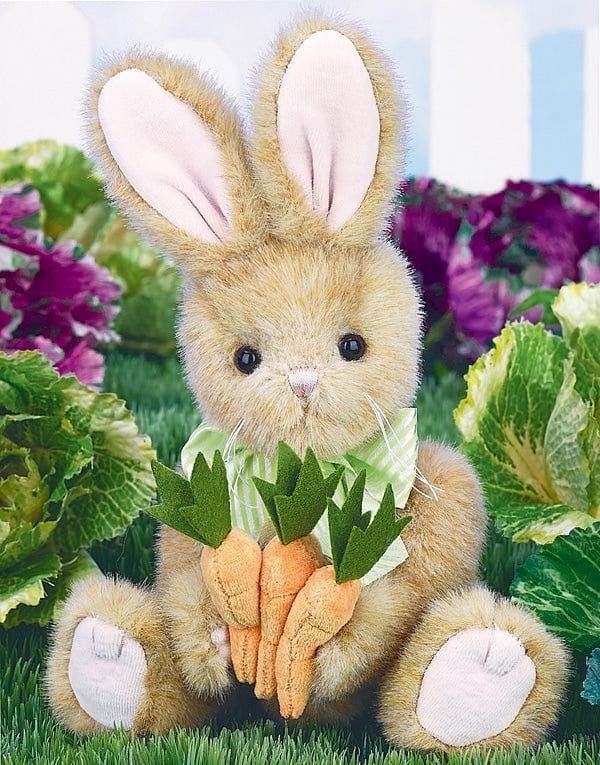 “Holden Carrots” Bunny From Bearington. Holdin’ his ‘freshly picked’ trio of felt carrots between his bunny paws, our super-soft plush bunny poses to show off the fruits of his labors.
