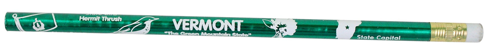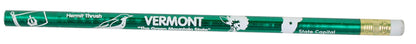 Wooden pencil with shiny green and white print. Vermont facts printed on such as the state flower, date of statehood, state song, etc.