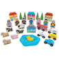 - Consists of 32 brightly colored play pieces including people, animals, vehicles, houses & trees.