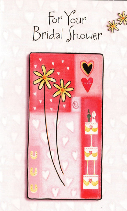 5 x 7 card showing flowers with a pattern of hearts and a wedding cake with the words "For your bridal shower." The inside reads, "Hope your wedding day will be just the beginning of a wonderful forever."