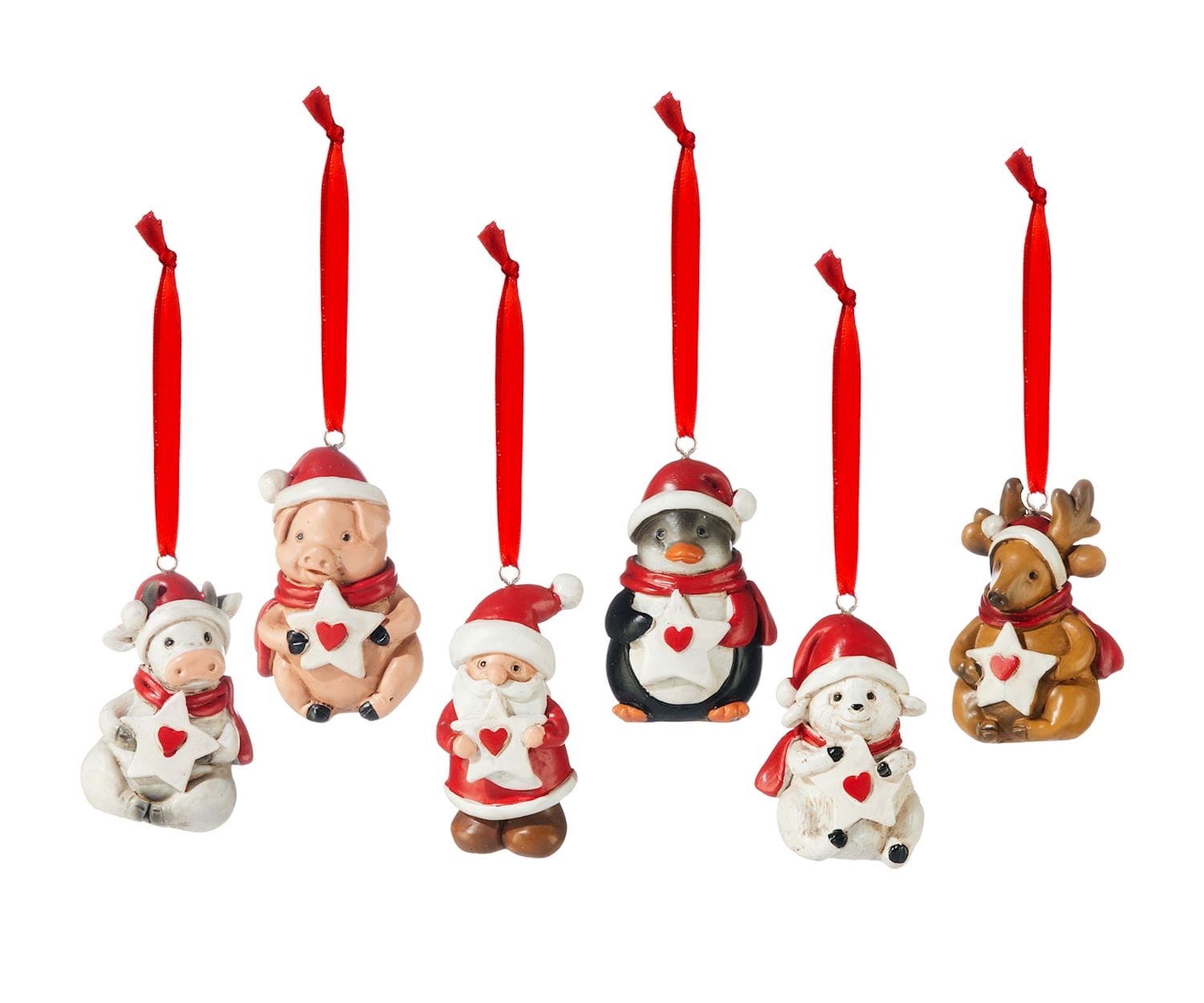 Dress your tree with charm and festivity with this cute yet classic Christmas Ornament. Crafted in the shape of an animal wearing Santa's hat, this resin Christmas ornament also features a white star with a red heart design. Available in 6 assorted styles: Cow, Pig, Sheep, Deer, Penguin, and Santa. Comes with hanging rope. Polystone.