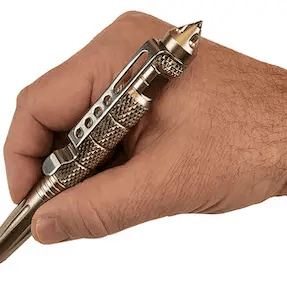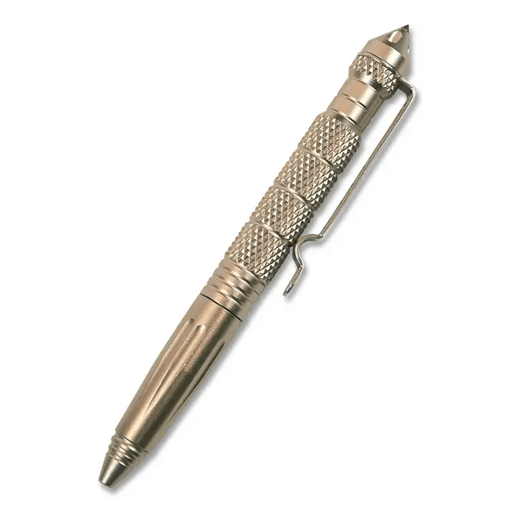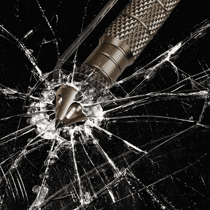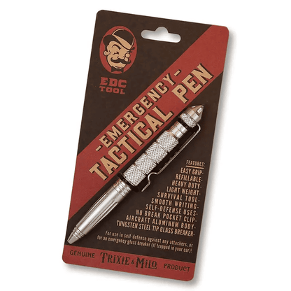Emergency Tactical Pen. A great gift idea for emergencies (breaks glass), and self-defense. Super chunky, but surprisingly lightweight - a fantastic gift! Tungsten steel tip strong enough to shatter any glass, diamond textured body for firm grip, aircraft grade aluminum body, smooth writing ballpoint tip, easy twist, standard refillable ink cartridge, no break clip to keep pen secured at all times. Made in China.