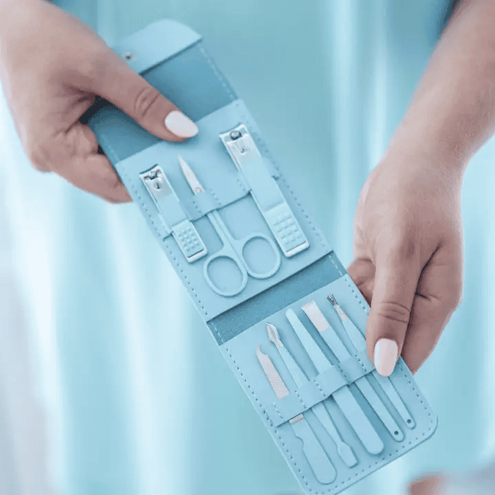 Durable stainless steel Includes: small nail clippers, large nail clippers, mini scissors, cuticle trimmer, nail file, nail scraper, cuticle pusher, tweezers