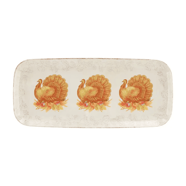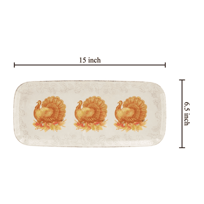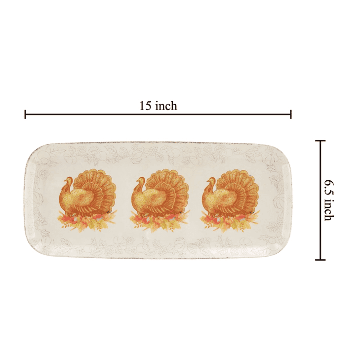 Festive Turkey Design: Each piece of serving tray features an enchanting turkey surrounded by wheat, pumpkin, and fruit patterns, setting the perfect harvest-inspired ambiance. Size: 15 inch L x 6 1/2 inch W x 3/4 inch H