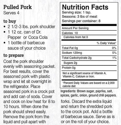 This delicious blend is so simple. Add one can of Dr. Pepper or your favorite cola and our spice packet to a pork shoulder and slow cook for delicious pulled pork!