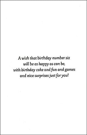 Inside: A wish that birthday number six will be as happy as can be, with birthday cake and fun and games and nice surprises just for you!