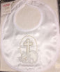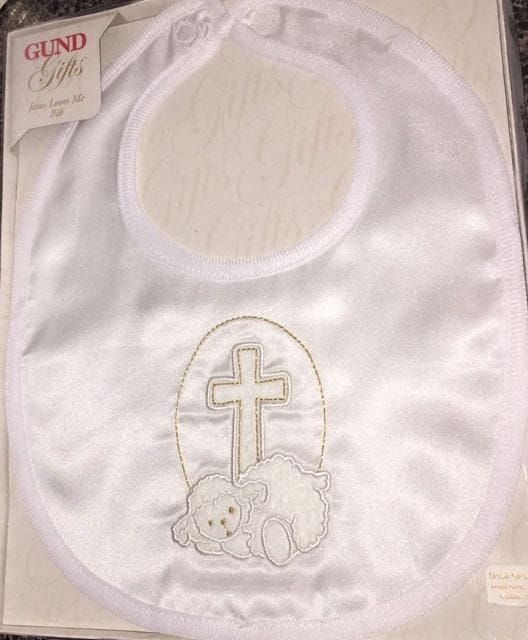 White bib with gold stitched Cross, and baby lamb laying at the bottom of the cross.