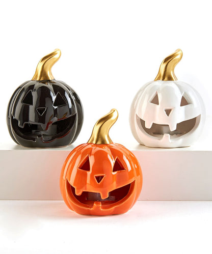 Light up you entryway console or side table with this smiling jack-o-lantern complete with golden stem.