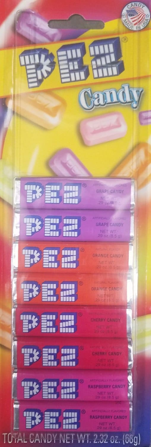 Pez candy refills a must have when you have pez dispensers. Each pack has 8 refills in assorted flavors. You get orange, cherry, lemon and strawberry 2 refills of each of the flavors. Pez candy is very similar to sweet tarts a hard rectangular piece of ca