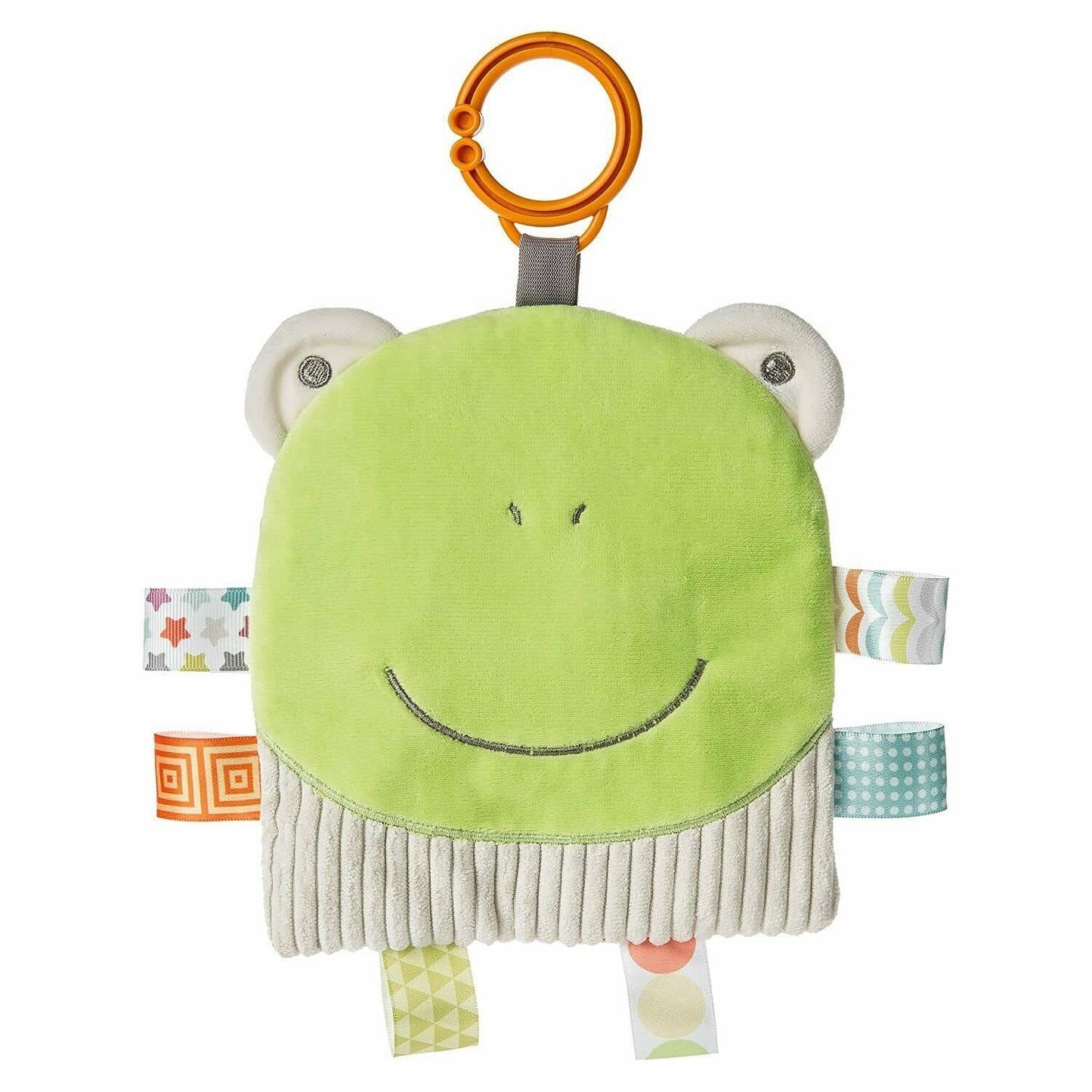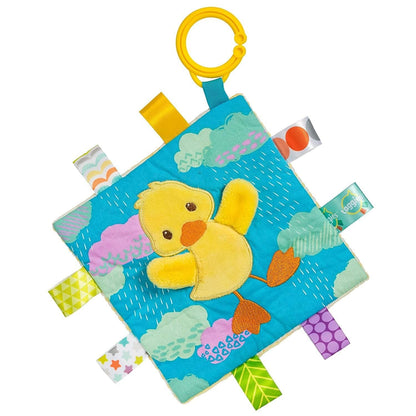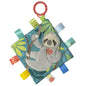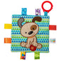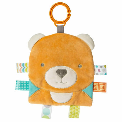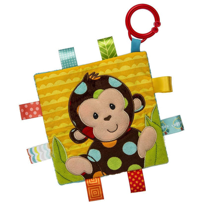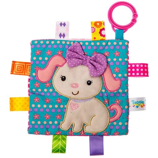 Each Crinkle Me Taggies has fun character appliques and colorful patterns on the outside, crinkle paper and a squeaker on the inside. Flexible loop for attaching to stroller and crib. 8 Taggies ribbons. Labeled machine wash, air dry.