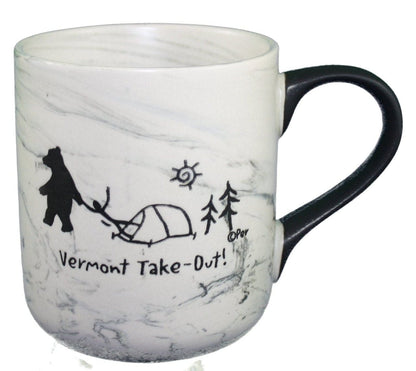 Ceramic coffee mug with a Marbleized finish. The front side (if you are right handed, Back side if you aren't) has a whimsical engraving by artist Per of Vermonter's Idea of Take Out food.